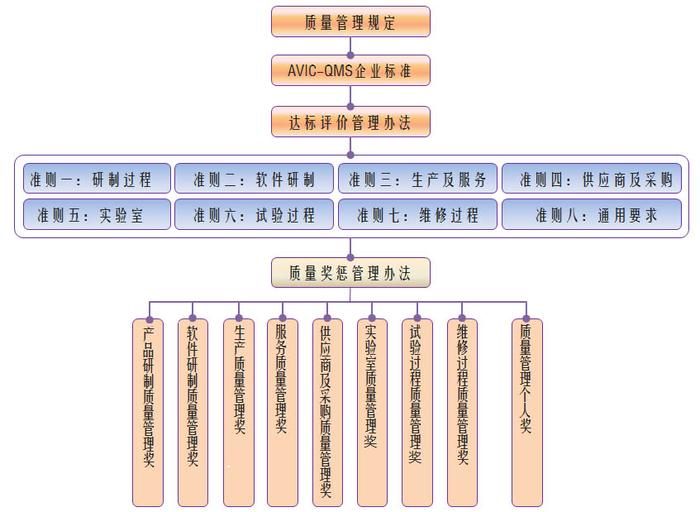 航空工業樹立“質量是航空人的生命”的工作信念,持續完善質量管理體系,形成具有航空工業特色的《質量管理體系要求》,以及基于過程域質量管理體系的量化評價理論框架與評價準則。AVIC-QMS(航空工業質量管理體系)評價工作的推進是集團公司針對新一代武器裝備研制能力建設和體系建設需求所采取的重要舉措之一,旨在通過對質量管理能力、管理水平及體系運行的有效性進行量化評價,發現薄弱環節,有的放矢的實施改進,引導各單位將質量體系做細、做實。這項工作自2010年推進至今,集團公司各單位在質量體系改進和質量管理能力提升方面取得顯著成效。集團公司質量管理體系達標評價推進實踐經驗被工業和信息化部評為全國“質量標桿”,同時曾榮獲“中國質量技術獎二等獎”。