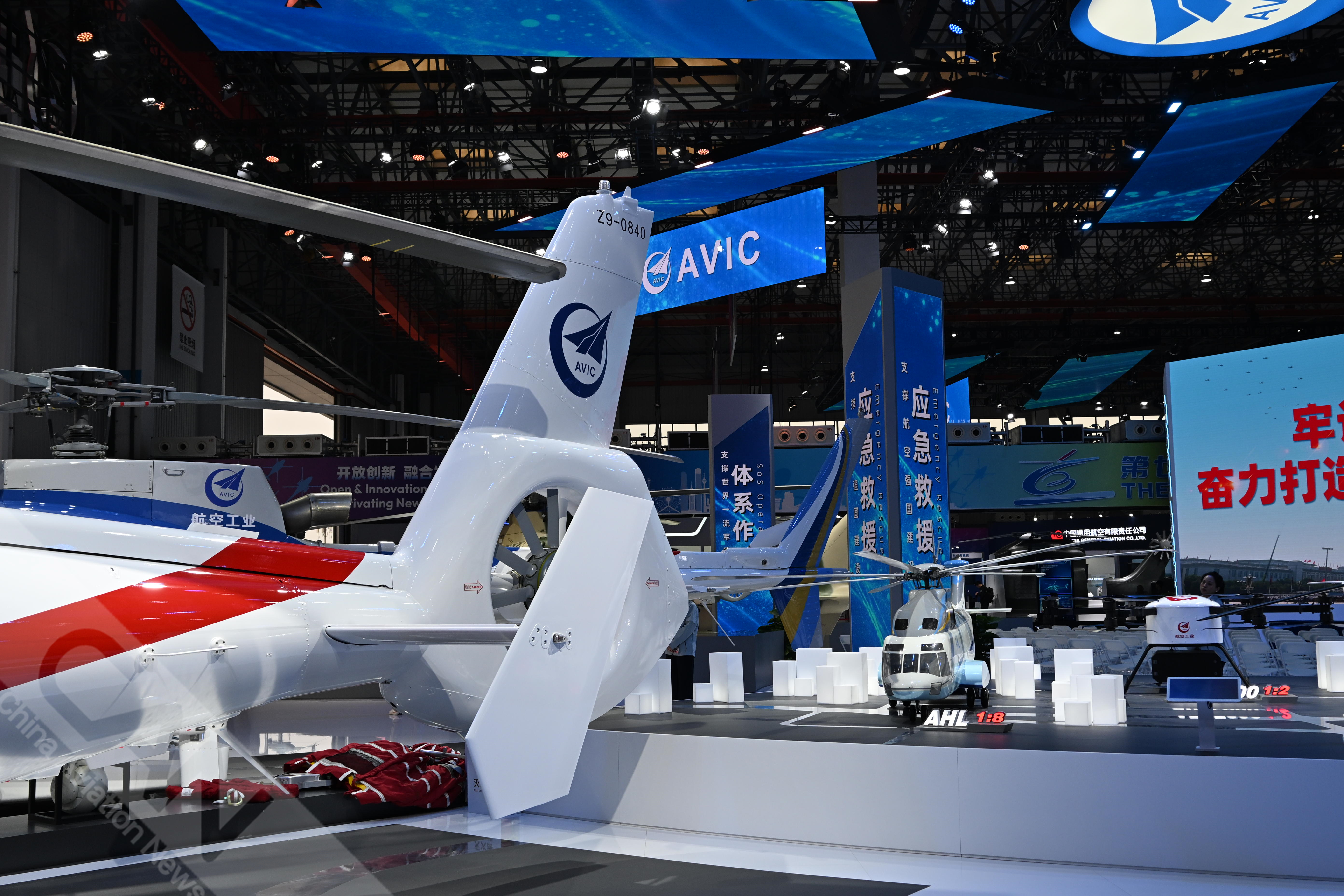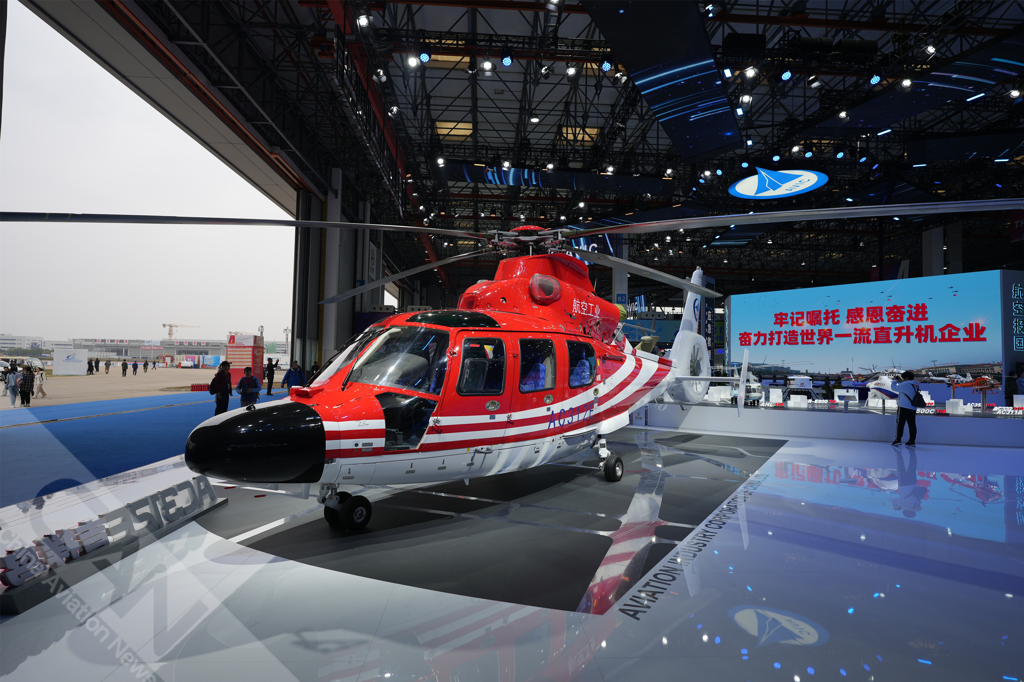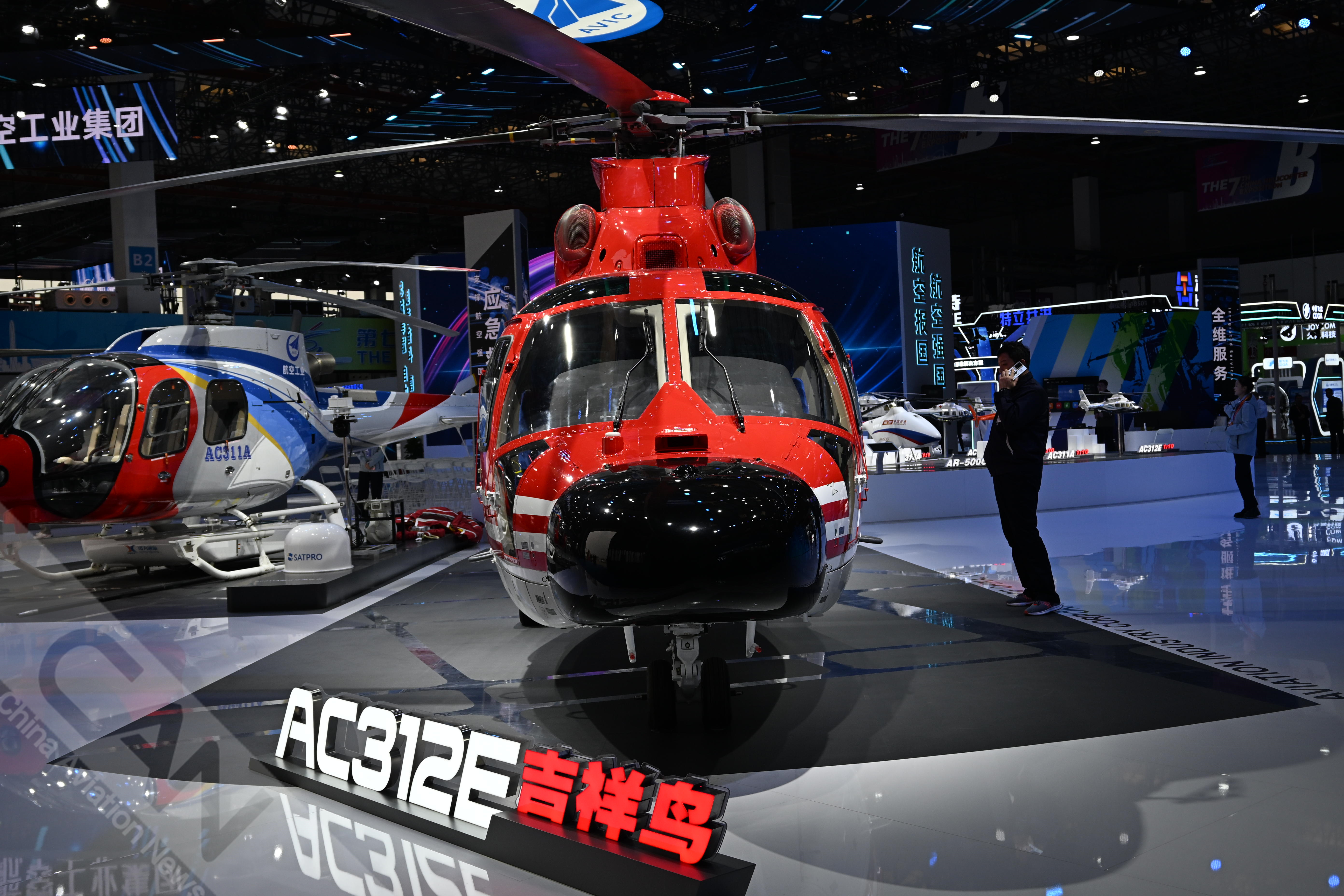 AC312E亮相第七屆天津直博會(huì)室內(nèi)展館。AC312E是航空工業(yè)集團(tuán)響應(yīng)國(guó)家通航產(chǎn)業(yè)發(fā)展研制的雙發(fā)多用途直升機(jī)。攝影:吳紫磨